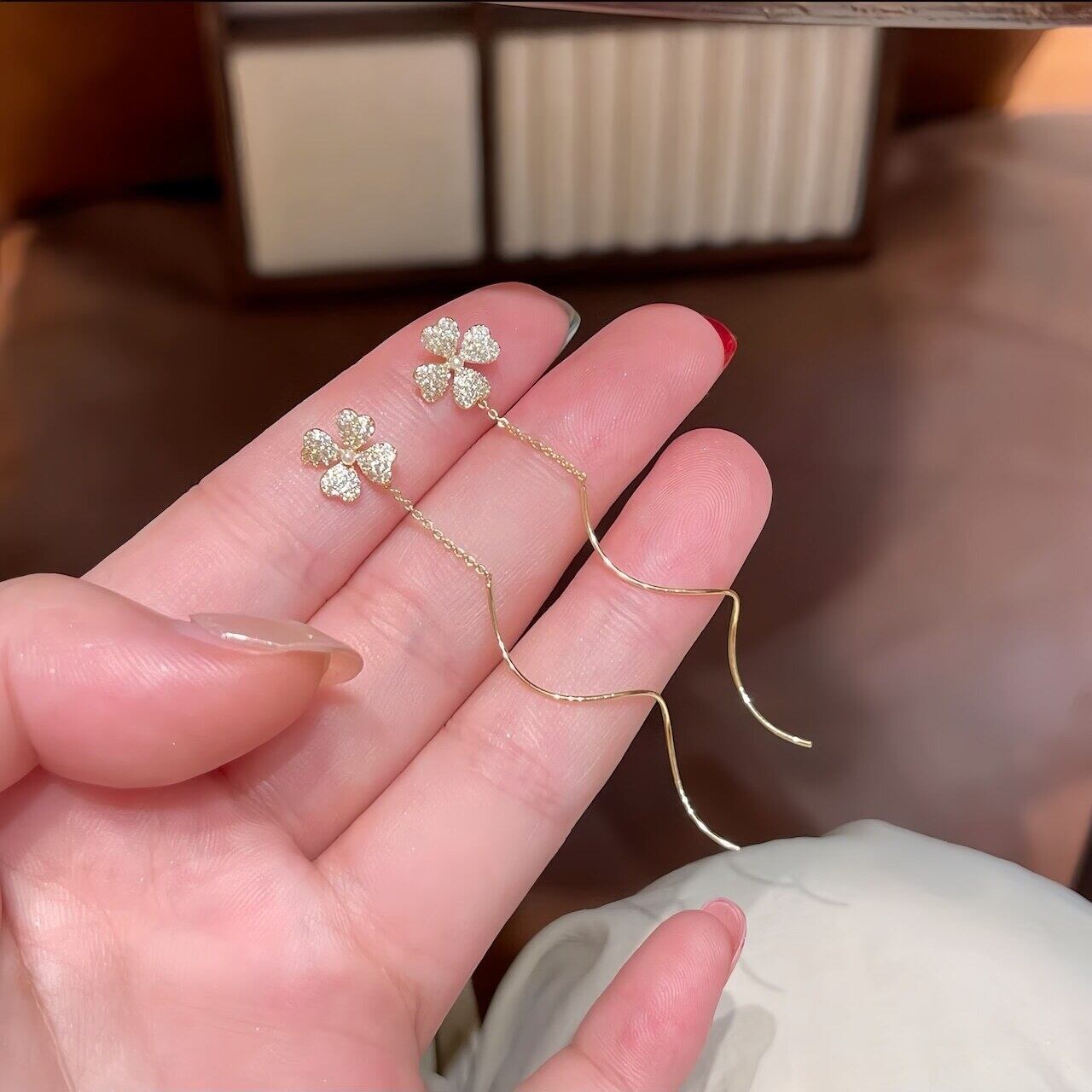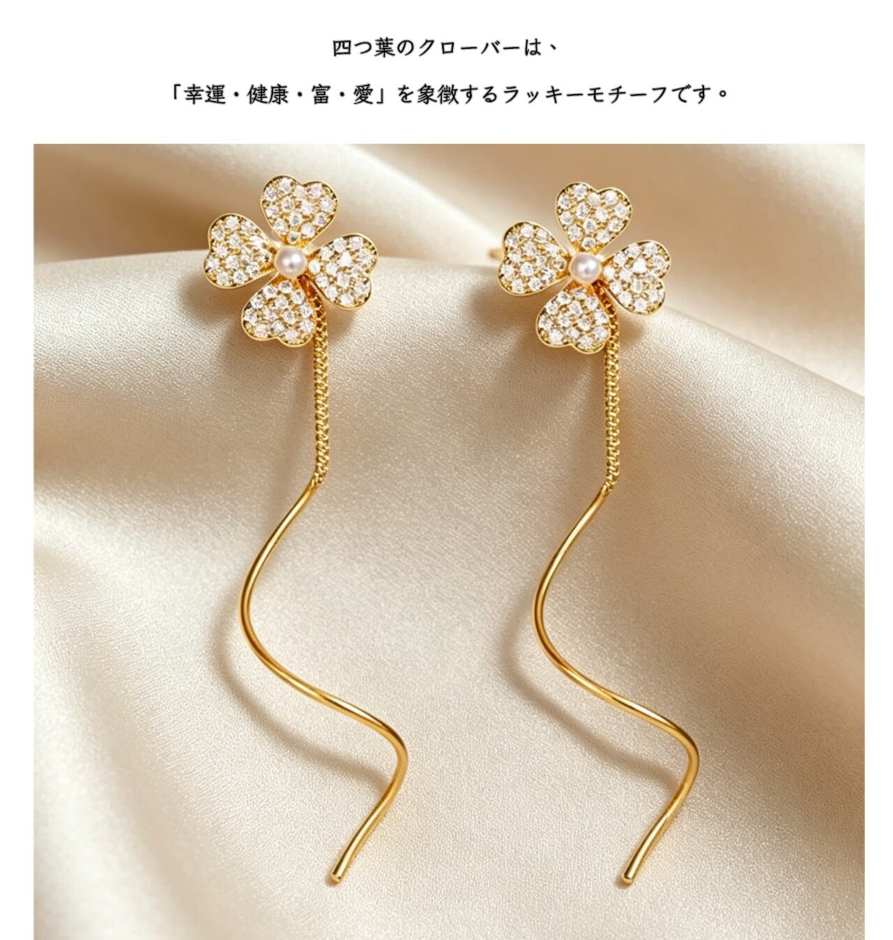 幸運の象徴「四つ葉クローバー」をモチーフにした、繊細で女性らしい揺れピアス。
